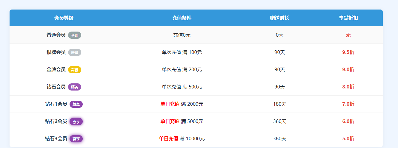 1. 会员等级根据充值金额判定,满足对应等级条件即可立即升级并享受相应特权